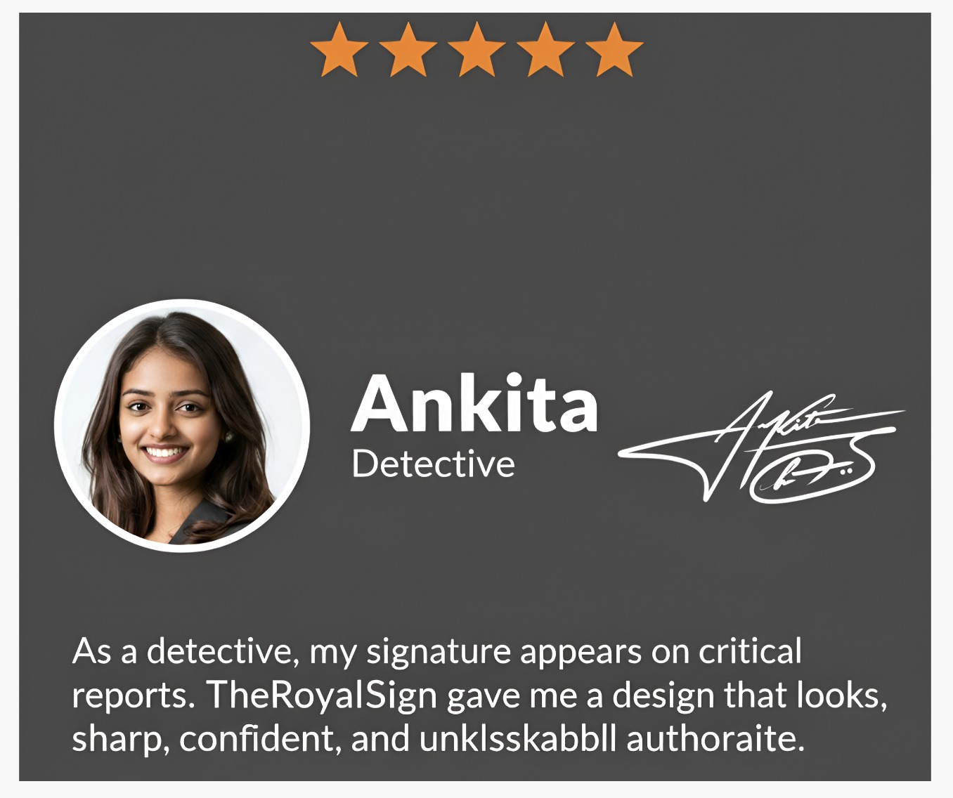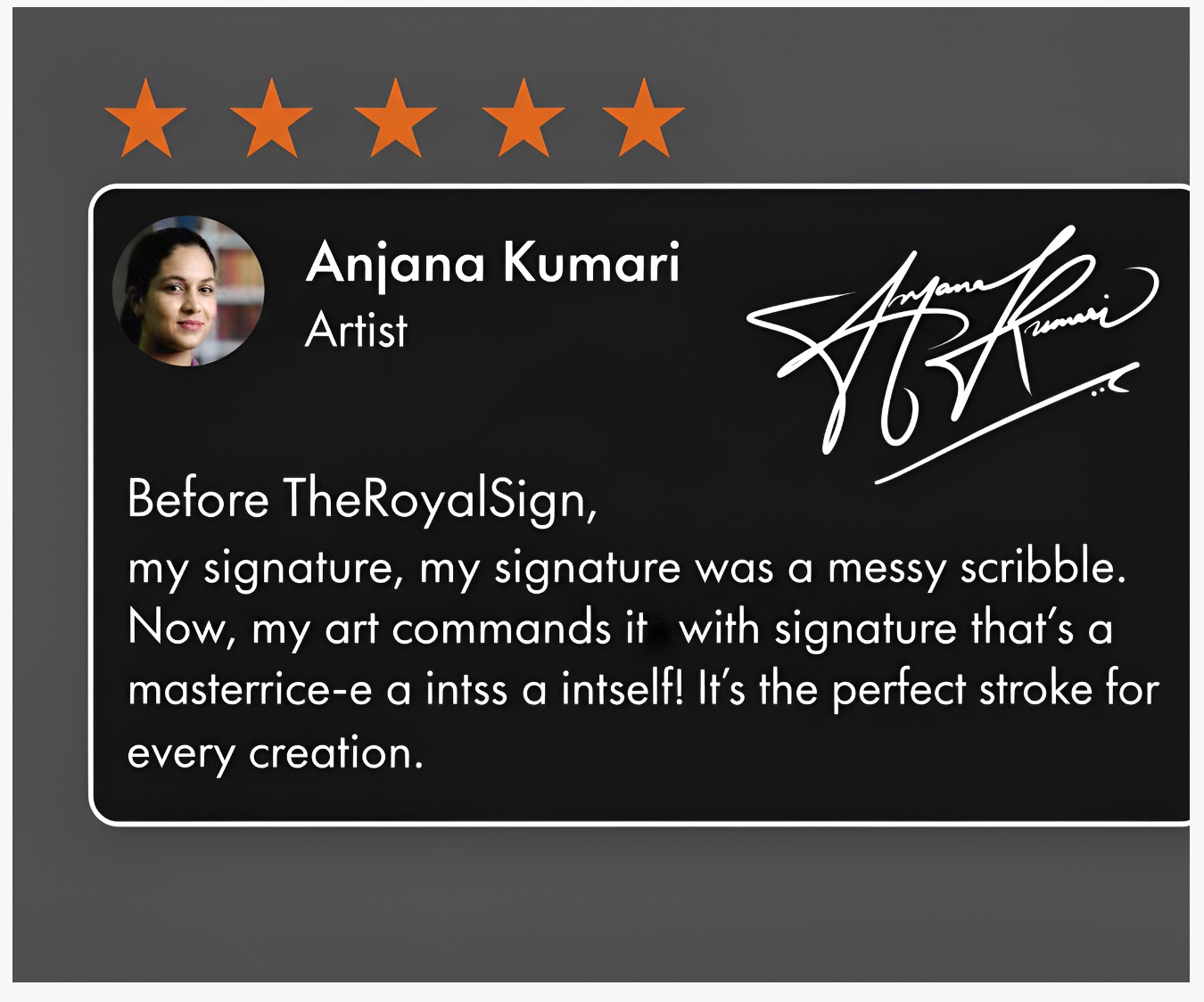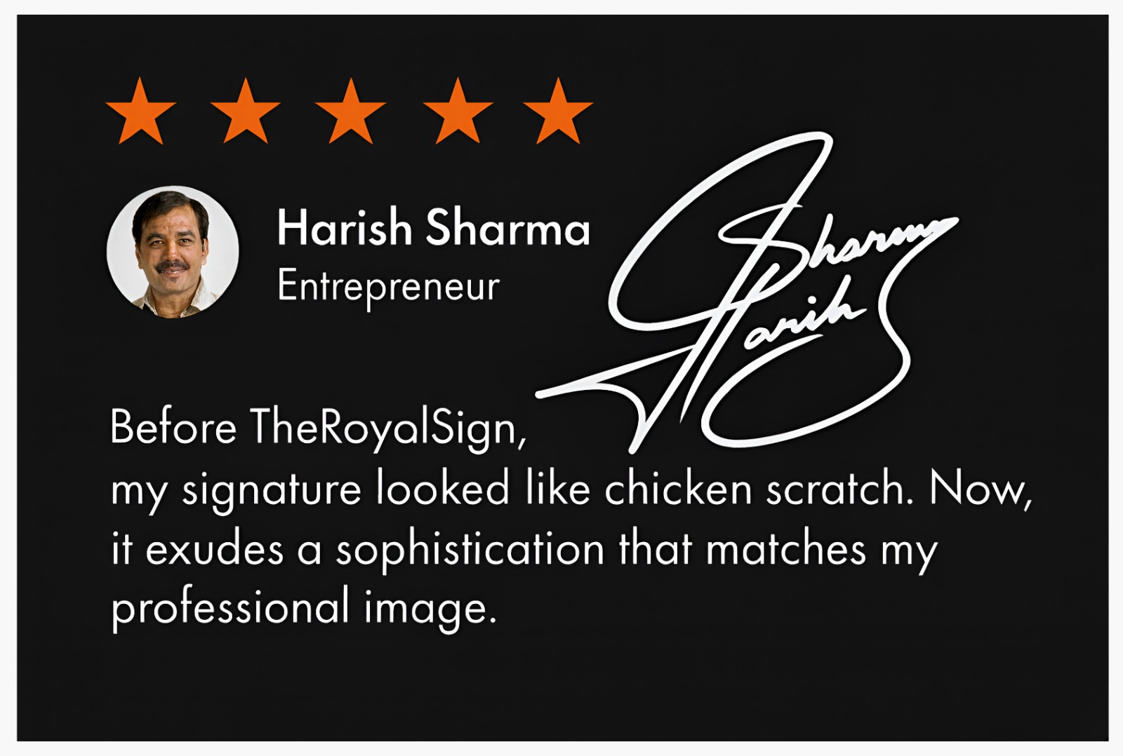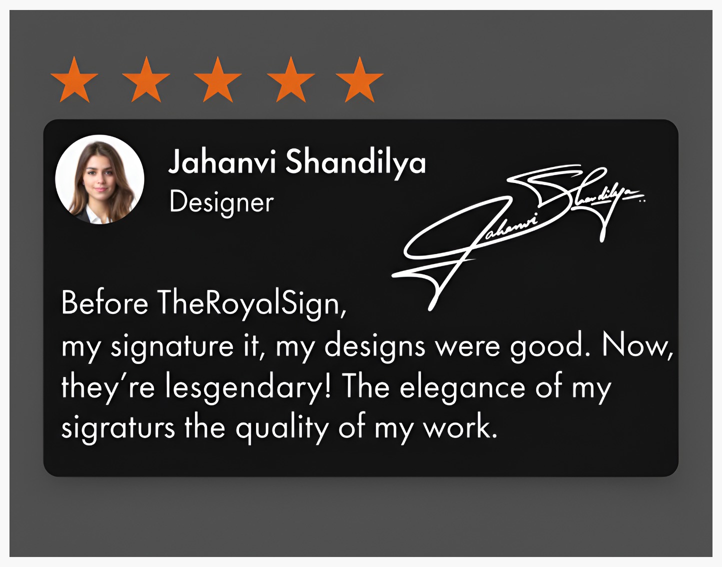 At The Royalsign, we craft elegant, custom handwritten signatures designed to elevate your identity and personal brand. With experience in creating 25,000+ unique signatures for clients worldwide, we focus on delivering designs that feel premium, balanced, and true to your style.
